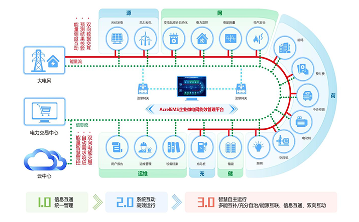 簡介:1.概述 通過在源、網(wǎng)、荷、儲(chǔ)、充的各個(gè)關(guān)鍵節(jié)點(diǎn)安裝監(jiān)測、分析、保護(hù)、治理裝置, 通過高性能邊緣計(jì)算網(wǎng)關(guān)采集數(shù)據(jù)并上傳至企業(yè)微網(wǎng)平臺(tái)。平臺(tái)根據(jù)新的電網(wǎng)價(jià)格、 用電負(fù)荷、電網(wǎng)調(diào)度指令等情況,調(diào)整各系統(tǒng)控制策略并遠(yuǎn)程下發(fā),使企業(yè)微電網(wǎng)始終高效穩(wěn)定運(yùn)行, 降低企業(yè)用電成本,實(shí)現(xiàn)能源互聯(lián)、信息互動(dòng)。 2.應(yīng)用場所 適用于各行業(yè)企業(yè)內(nèi)部微電網(wǎng)管理系統(tǒng)的新建、擴(kuò)建、改建等項(xiàng)目。 3.平臺(tái)結(jié)構(gòu) 3.平臺(tái)功能 安科瑞AcrelEMS企業(yè)微電網(wǎng)能效管理平臺(tái)融合了電力監(jiān)控、電氣安全、照明控制、能源管控、充電樁運(yùn)營管理、分布式光伏監(jiān)測、儲(chǔ)能管理、設(shè)備臺(tái)賬、運(yùn)維管理等功能,通過一個(gè)平臺(tái)、一個(gè)APP整體的對(duì)企業(yè)用電進(jìn)行集中監(jiān)控、統(tǒng)一調(diào)度、統(tǒng)一運(yùn)維,并且根據(jù)當(dāng)?shù)毓╇姴块T錯(cuò)峰避峰計(jì)劃提前為企業(yè)制定錯(cuò)峰避峰方案和預(yù)警,滿足企業(yè)